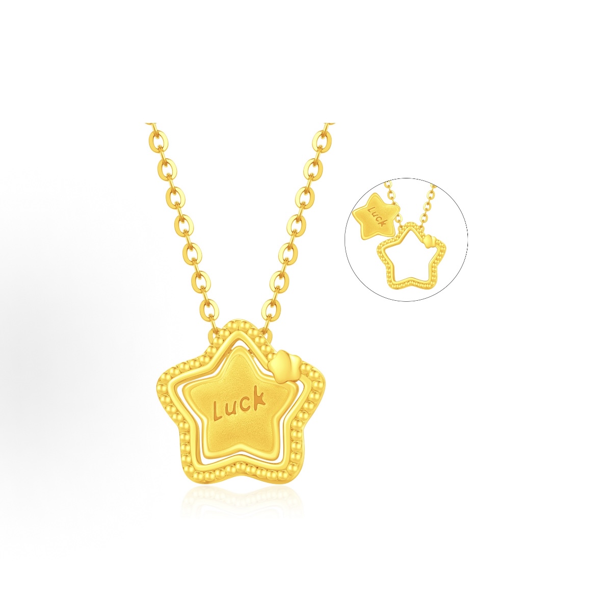 Featuring a charming double-layer star design, this necklace showcases an openwork star hoop on the outside and a solid star pendant engraved with "LUCK" on the inside. Packed with exquisite details and a captivating vibe, it is accented by a tiny heart detail at the center—sweet and delicate all at once! This is absolutely the "lucky talisman" in your jewelry box.