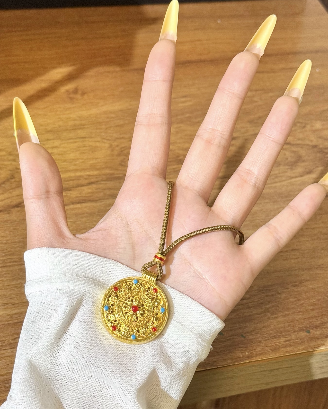 Elevate your everyday with this 1.8g pure gold Eight Treasures Compass Pendant. Meticulously crafted using traditional Chinese filigree art, it features intricate patterns and vibrant red and blue enamel inlays that symbolize good fortune, prosperity, and blessings from all directions. Lightweight yet luxurious, this piece is more than just jewelry—it’s a wearable talisman of timeless luck and refined style. Perfect for layering or wearing alone, it adds a touch of opulence to any outfit while carrying the wisdom of ancient traditions.
