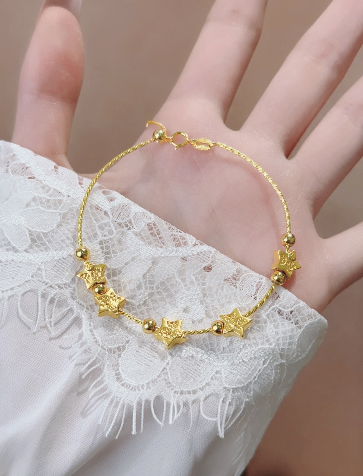 Elevate your everyday look with our 1g Pure Gold Five-Star Beaded Bracelet. Meticulously forged from 24K gold, the five intricately detailed star beads catch the light with every movement, while the lightweight construction ensures all-day comfort. Perfect for layering with other bracelets or wearing alone, this piece is a timeless celebration of celestial beauty and understated luxury.