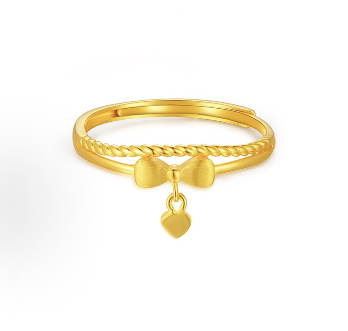 Designed for the modern princess, this ring features a unique double-layer twisted band with a delicate 3D bow at the center. Adding to its charm is a tiny dangling heart charm that sways gently with your every move, symbolizing endless love and sweetness.