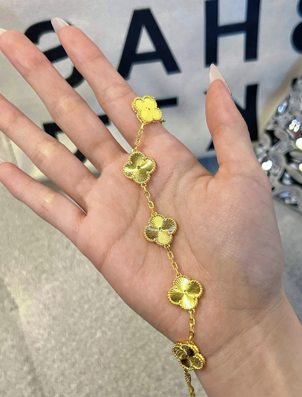 Elevate your everyday with our 2g pure gold clover bracelet. Each four-leaf clover charm features a stunning guilloché finish, catching the light with every movement. This iconic design symbolizes good fortune and prosperity, making it the perfect accessory to elevate your everyday look. Lightweight and versatile, it’s ideal for layering or wearing alone, adding a touch of luxury to any outfit. Crafted with meticulous attention to detail, this bracelet is a must-have for anyone who appreciates classic style and enduring beauty.