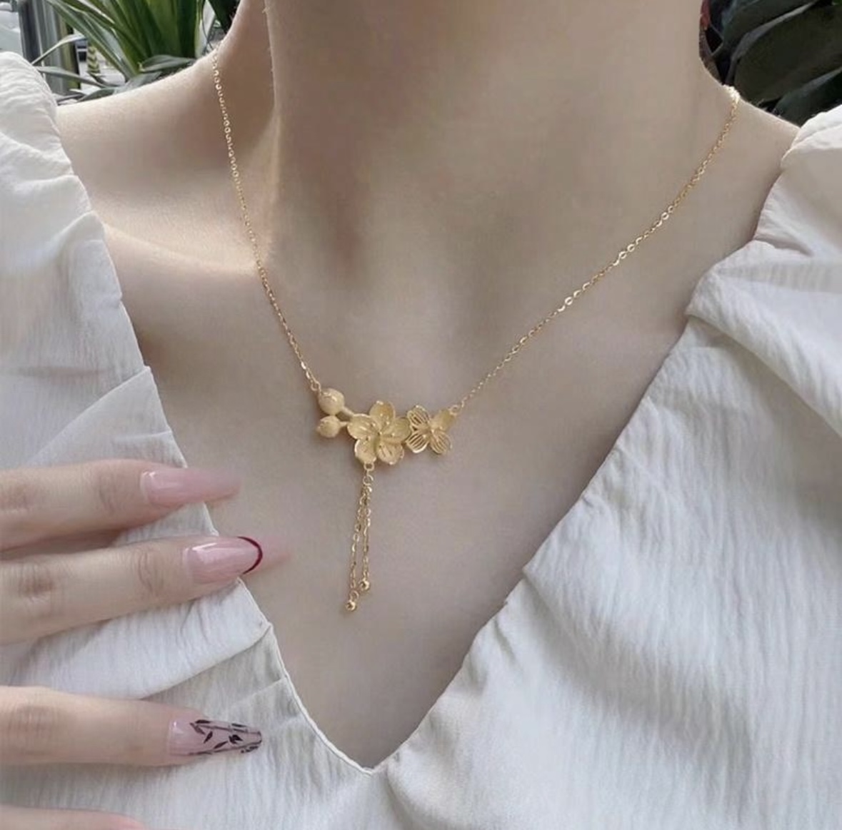 Elevate your everyday elegance with our 6.5g Pure Gold Twin Blossom Necklace. Meticulously crafted from solid 24K gold, this piece features two intricately detailed flowers and buds, with a subtle tassel that adds a gentle, feminine movement. The lightweight design makes it perfect for layering or wearing alone, while the timeless design ensures it will be a cherished part of your jewelry collection for years to come. A true investment in luxury and beauty.