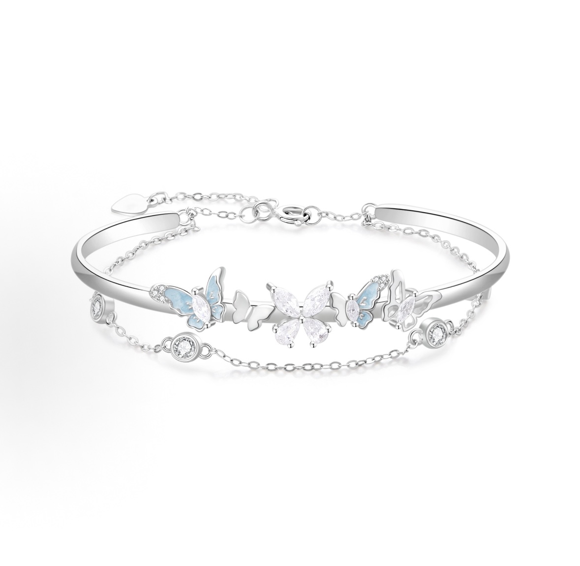 Crafted from premium 999 sterling silver (7.82g), this "Iridescent Butterfly" bracelet features a stunning dual-layer design. A sleek bangle is adorned with butterflies in shimmering mother-of-pearl and sparkling cubic zirconia, while a delicate chain with bezel-set stones adds a touch of ethereal movement. The butterfly symbolizes transformation and beauty, making this piece a romantic accessory for special occasions or everyday wear. Lightweight, hypoallergenic, and effortlessly dreamy, it’s the perfect way to add a touch of whimsical elegance to any outfit.